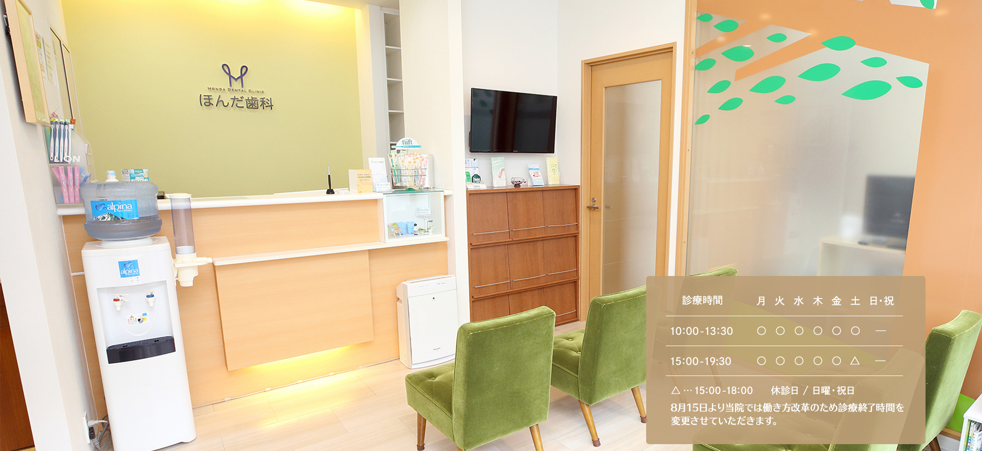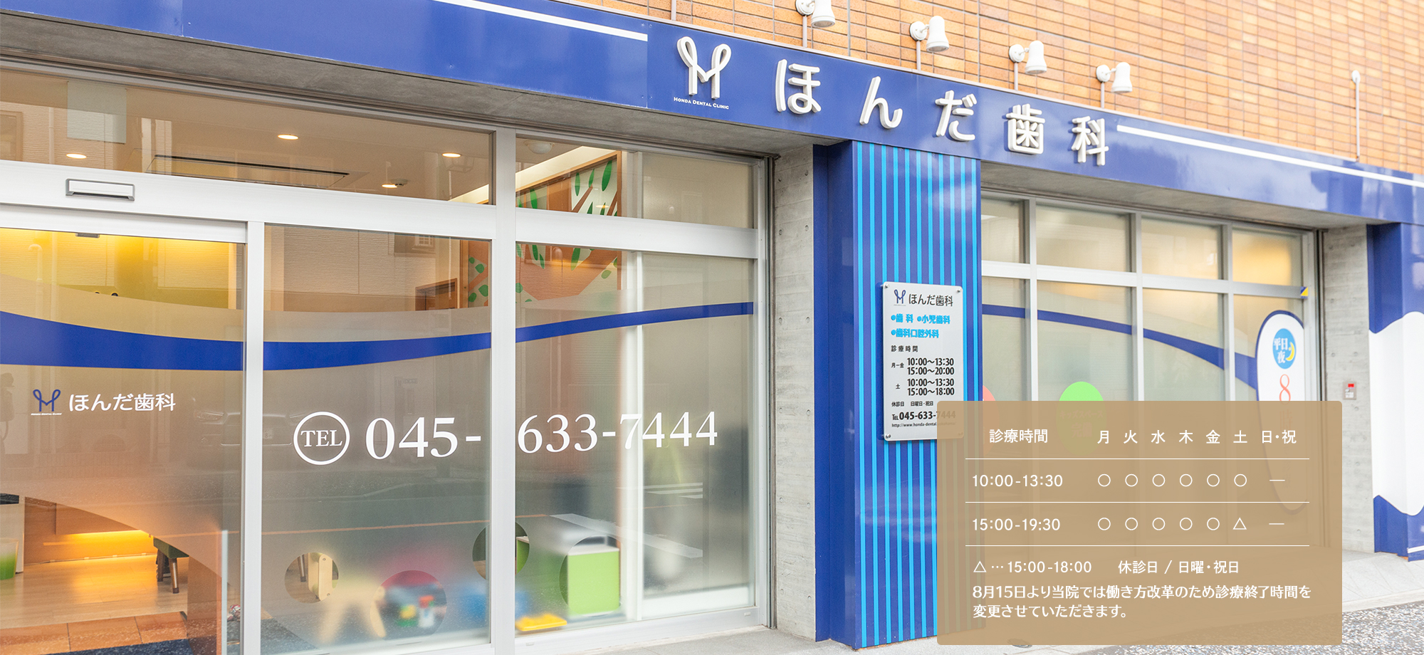 綱島駅から徒歩5分、綱島本通郵便局すぐそばの歯医者「ほんだ歯科」のホームページをご覧いただきありがとうございます。当院は小さなお子様からご年配の方まで、安心して信頼される歯科治療を心がけております。平日は19:30まで診療しておりますので、お仕事や学校帰りにご来院いただけます。お子様を連れて治療に通えるようにファミリールームやキッズスペースを完備しており、お子様と同じお部屋で治療を受けることも可能です。年配の方やベビーカーの方も安心して通えるようにバリアフリーに対応しております。院内は土足でも構いませんので、足が不自由な方や、靴の履き替えが難しい方にもご利用いただけます。当院は綱島の地域の皆様のお口の健康を守るため、スタッフ一同全力でお手伝いいたします。歯やお口に関するお悩みがある方はお気軽にご相談ください。